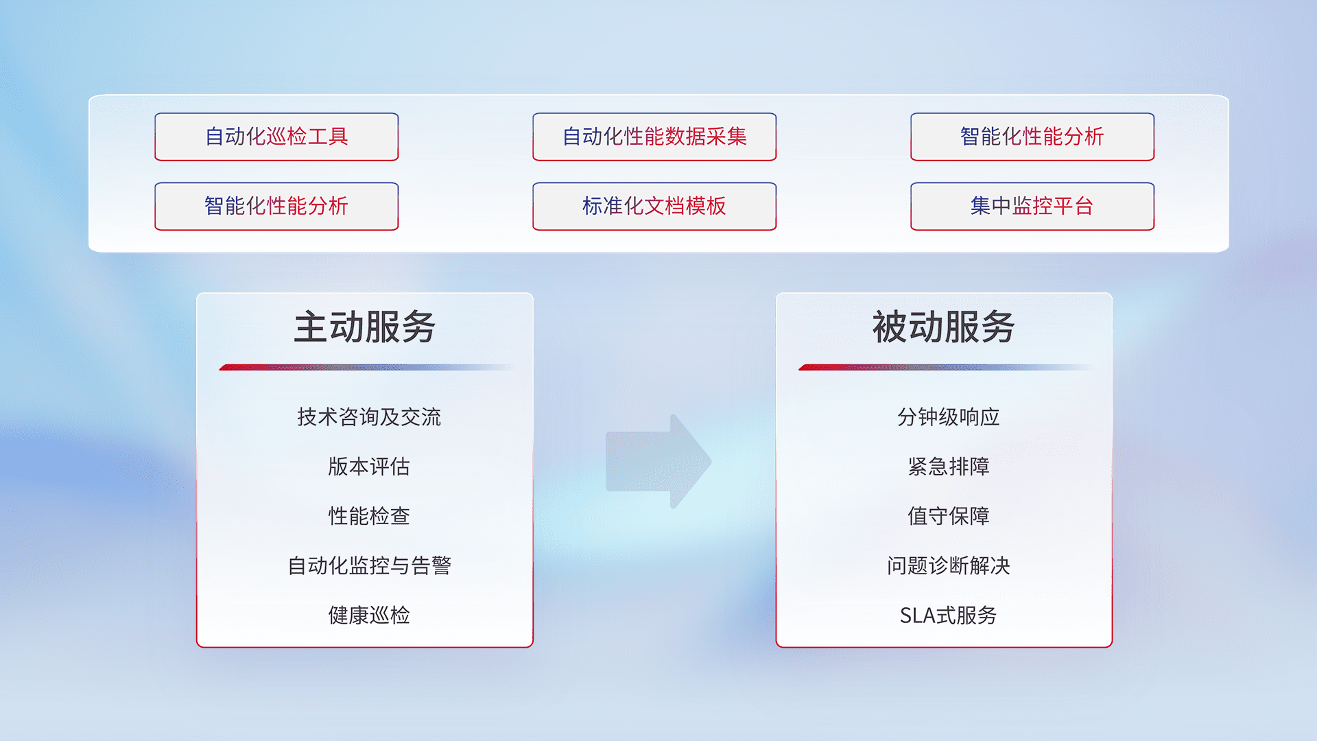 智能化工具和标准化文档,,保障服务质量,,,,提供主动服务(包含技术咨询、、版本评估、、、性能检查、、、自动化监控与告警、、、、健康巡检)和被动服务包含(分钟级响应、、、紧急排障、、、、值守保障、、、问题诊断解决、、、、SLA服务)。。。